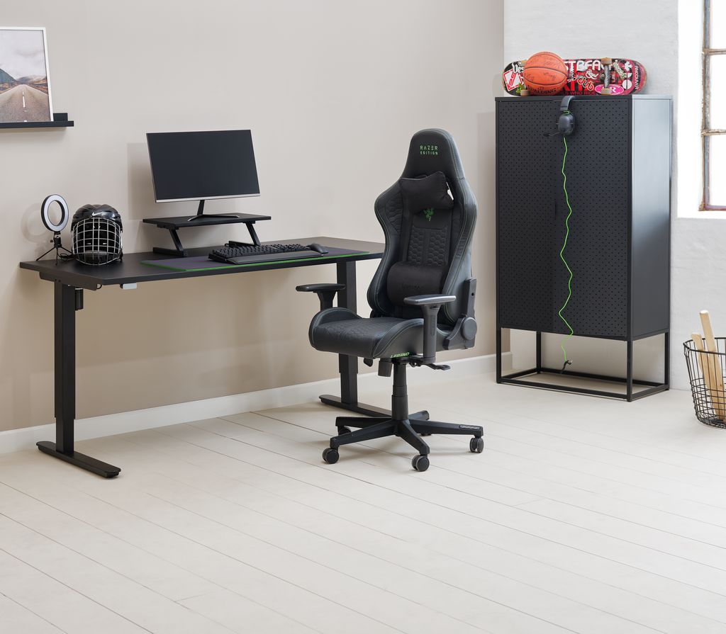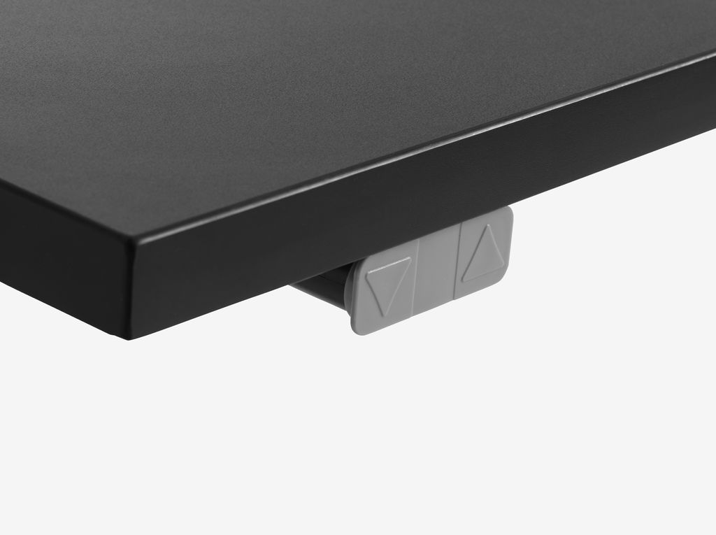 Cadre et piètement : acier. Plateau : panneau de particules mélaminé. Bureau électrique réglable en hauteur. l80 x L160 x H68-119 cm