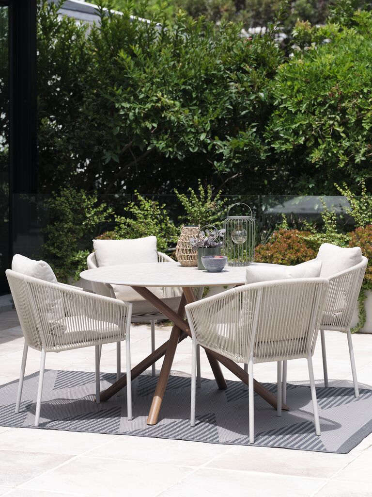 Ensemble de meubles de jardin 4 personnes. Table : acier et ciment. Ø120 x H74 cm. Chaise : aluminium et polyester. Incl. coussin haut de gamme avec housse résistante à séchage rapide. La housse intérieure possède un revêtement imperméable qui empêche l'eau de pénétrer dans le coussin. Empilable.